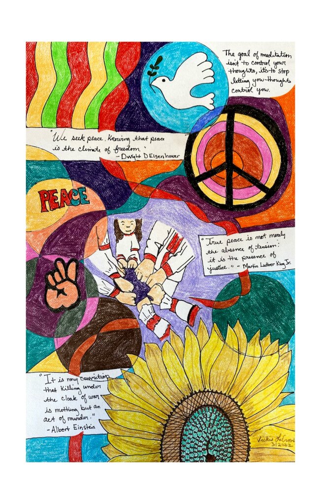 Visual artist Vickie LaCroix is also passionate about taking action. “I wanted to create art in support of the Ukraine people because this war is barbaric. Innocent people are being targeted and killed. Seeing the suffering of the people breaks my heart. I want them to know there are people around the world who support and care for them.”